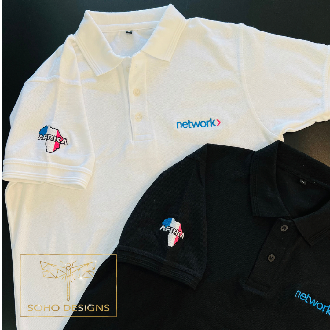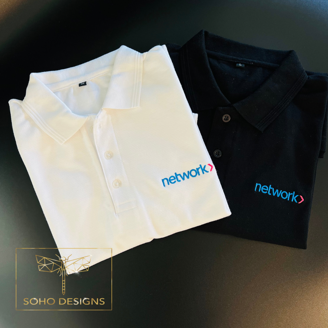 - Personalized company polos with embroidered logos on the front and one sleeve